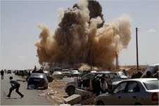 De altfel, autorităţile de la Tripoli au anunţat că forţele pro-Gaddafi controlează Misrata, ceea ce opoziţia neagă. Între timp, preşedintele american Barack Obama a declarat că Statele Unite vor transfera comanda operaţiunilor din Libia în următoarele zile, pentru a se asigura că povara impunerii unei zone de excludere aeriană este împărţită. El a precizat şi că Statele Unite vor ca Muammar Gaddafi să fie îndepărtat de la putere, dar a insistat că actuala campanie este orientată pe apărarea civililor. „Acţiunea noastră militară este în baza unui mandat internaţional din partea Consiliului de Securitate, care se concentrează pe ameninţarea umanitară reprezentată de colonelul Gaddafi pentru poporul său. Nu numai că a ucis civili, dar a ameninţat şi mai mulţi”, a spus el. Colonelul Muammar Gaddafi a ordonat ca civilii să fie folosiţi drept scuturi umane pentru a evita bombardamentele forţelor aliate, existând chiar informaţii că un şofer dintr-un convoi al armatei a fost legat cu cătuşe de volan pentru a fi împiedicat să fugă. De altfel, chiar televiziunea libiană de stat a anunţat că susţinătorii lui Gaddafi se îndreaptă voluntar către aeroporturi pentru a servi drept scuturi umane. Forţele lui Gaddafi i-au obligat pe oamenii din Zawiyat al Mahjoub şi Al Ghiran să iasă din case, le-au dat portretele lui Gaddafi şi steaguri verzi şi îi duc spre Misrata – singurul fief al rebelilor din vestul ţării – pentru a putea intra în oraş şi a-l controla folosindu-se de ei ca de nişte scuturi umane, pentru că ştiu că rebelii nu ar împuşca femei, copii şi bătrâni, a declarat un purtător de cuvânt al rebelilor. Potrivit unor informaţii care nu au putut fi verificate independent, oraşul Misrata a fost infiltrat de oameni ai lui Gaddafi îmbrăcaţi în civil care au ca misiune să se amestece printre „susţinătorii” care sunt duşi către aeroporturi pentru a împiedica atacurile coaliţiei. Pe de altă parte, circa 300 de persoane s-ar fi aflat în complexul rezidenţial Bab Al-Aziziyah din Tripoli, care a fost atacat duminică noaptea de forţele coaliţiei. O rachetă de croazieră a lovit o clădire administrativă din complexul lui Gaddafi, dar deocamdată nu au fost anunţate victime. Duminică, o misiune în care ar fi fost implicate avioane britanice Tornado a fost anulată, după ce în momentul apropierii de ţintă a fost semnalată prezenţa civililor. Bombardiere B-2, care nu pot fi depistate de radare, au fost trimise într-o misiune de 25 de ore de la baza lor din Missouri către Libia pentru a lansa 45 de bombe de 900 de kilograme.